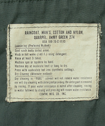 ■制式名称:RAINCOAT, MAN''S COTTON AND NYLON, QUARPEL, ARMY GREEN 274