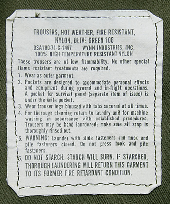 NAM戦時に採用、使用されたノ−メックス(難燃)素材製のヘリクルーパンツ。裾をベルクロ(マジックテープ)で絞る初期仕様。実物極上放出品。