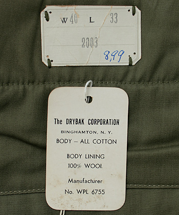 米海軍において40年代後半に採用され、50年代前半迄製造、支給されていたオリーブ・グリーン色のフライトパンツ。本来はAL-1フライトジャケットとコンビで着用。日焼けによる若干の保管汚れあり。