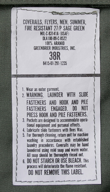 ■制式名称:COVERALLS, FLYERS, MEN, SUMMER, FIRE RESISTANT 27/P SAGE GREEN