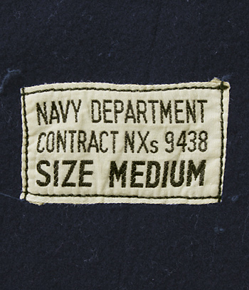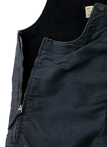 大戦米海軍において、採用、支給されていたブルーカラーでサイドの開閉金具がZipper式の大戦初期仕様のデッキ・パンツ。本来は同仕様のジャケットとコンビで着用。本品は織ラベルタイプ。金属部分に些細な錆の発生等あり。実物極上品。