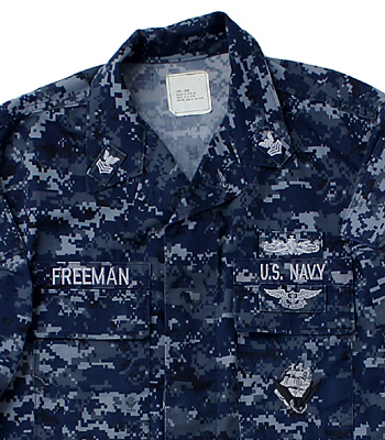 テスト採用を含め2008年頃から登場した米海軍新型迷彩NWU(※Navy Working Uniform)デジタルパターンの野戦服/上衣、NAVYフルパッチ品。実物極上放出品。