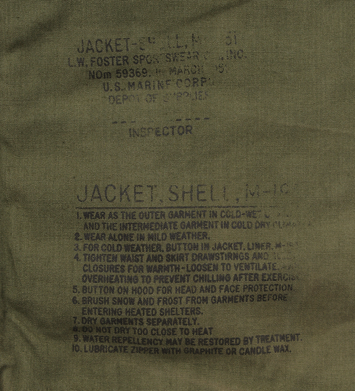 米海兵隊において1951年採用された“M-51 フィールド・ジャケット”は1965年“M-65”が採用される迄の間、継続使用された50年代を代表する米軍フィールド・ジャケット。襟裏に収納型のフードが付かない点以外は“M-65 フィールド・ジャケット”で採用されたほぼ全てのスペックは“M-51”において完成されていた。希少なマリーン独自のM-51フィールドジャケット、M43フード付き、実物・極上、放出品! !