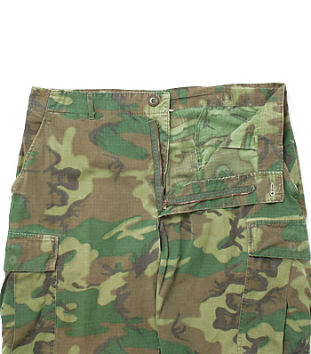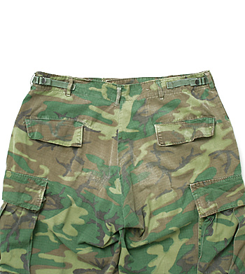 NAM戦時に採用、支給されていたERDLカモ柄(通称リーフカモ)野戦パンツ。色調はグリーンリーフ又は初期リーフと呼ばれるグリーンの色調が強いタイプ。実物USED放出品。