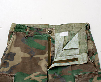NAM戦時に採用、支給されていたERDLカモ柄(通称リーフカモ)野戦パンツ。色調はブラウンリーフ又は後期リーフとコレクター間で呼ばれるタイプ。実物USED放出品。