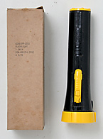 1970年代の米軍において引火の危険のあるエリア、場所での使用に採用、支給されていたイェローとブラックのツートンカラーのストレート型フラッシュライト。オリジナル紙BOX入。実物未使用品。