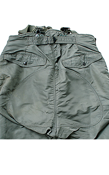 U.S. AIR FORCEマークがウェスト部左正面にあるセージ・グリーン色仕様のF-1Bナイロン製フライトパンツ。サスペンダー付。1950年代後半期コントラクトのDモデル。実物・極上品。