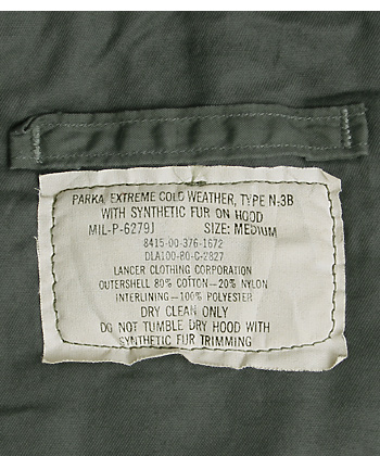 1953年(推定)採用され、以後約40年の長きにわたりUSAF(米空軍)において継続使用されたN-3B Parka。1980年コントラクト。ジャケット自体は純然たる米空軍支給のN-3B Parka/Jモデルであるが、縫い付けられたパッチから米海軍、VF-211所属の兵士に使用された物であることがわかる。空軍の物が海軍、又その逆等で使用される事自体は往々にしてあることである。実物・極上放出品。