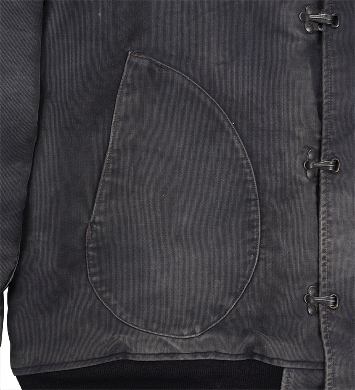 1943年採用、1944年9月 N-1デッキジャケット & デッキパンツ登場まで継続支給された米海軍M43デッキジャケット(Hook型ファスナーモデル)。消耗が最も激しかった43-45年に使用されたこのジャケットの残存数は極めて少なく、残存するジャケットにおいても兵士の乱暴な取扱によりHook型金具が破損したものが殆どのようだ。金具も機能しコンディションの良い実物の入手は極めて困難な『米海軍M43デッキジャケット(Hook型ファスナーモデル)』。実物極上(美品)、コレクターズ・アイテム!!