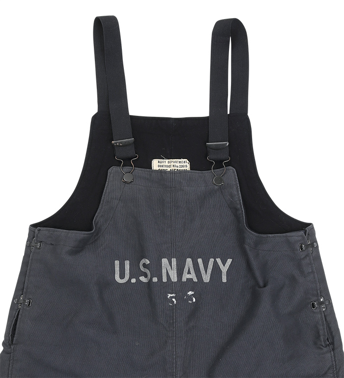 1943年採用、1944年9月 N-1デッキジャケット & デッキパンツ登場まで継続支給された米海軍M43デッキパンツ(フック金具モデル)。消耗が激しかった43-45年に使用され、コンディションの良い実物の残存数は極めて少ない。実物・極上、コレクターズ・アイテム!!