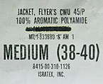 米軍現用“Nomex”(ノーメックス)難燃性、耐熱繊維素材製のCWU-45/Pコールドウェザー・フライトジャケット、Dモデル。ラベル上のコントラクトNo.部に『消し』あり。