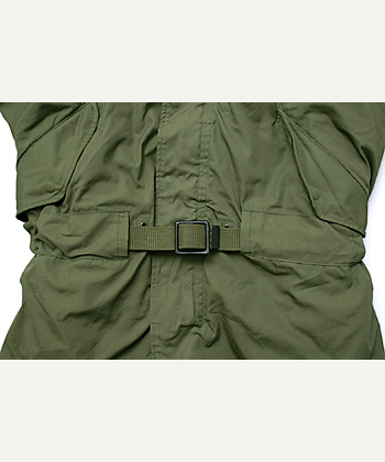 後期薄手ポプリン生地製シェルに、初期仕様ウール・パイル地・起毛ライナー付のM-1951 フィールドパーカーをベースに、ウェスト部ベルトループの増設、裾部をフラットに改造し M-1947パーカースタイルとしたM51パーカーMOD.品。ODトラウザーズベルト(1945年製)付。実物極上品。
