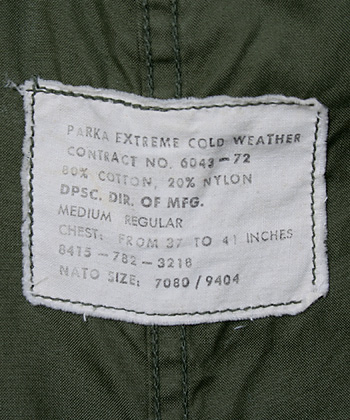 本体(シェル)、フードのセットでM-51パーカー用後期ライナーが付いた、DPSC, DIR. OF MFG.(米軍補給部製)、1972年コントラクト品