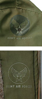 大戦時、米陸軍航空隊におけるTYPE B-15 フライトジャケット。左肩口、左前身頃内サイドに各々AAFデカール付。襟ボア、両袖口にダメージ箇所あり。