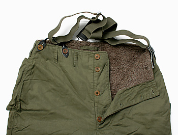 大戦時、米陸軍航空隊において採用、支給されていた防寒用TYPE A-10フライトパンツ。本来はB-11パーカーとコンビで着用。ODカラー・トラウザーズ・サスペンダー付属。