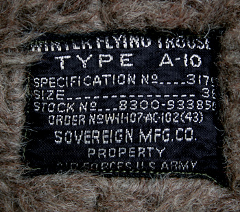 US AAF(米陸軍航空隊) WWII A-10 フライト・トラウザーズ/SOVEREIGN MFG. CO./ORDER NO.W-11-107-AC-102(43) /サイズ:36/実物・良の上