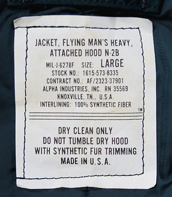 ●表記制式名称:JACKET, FLYING MAN'S HEAVY, ATTACHED HOOD N-2B