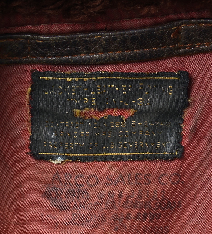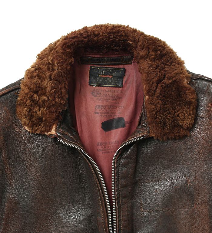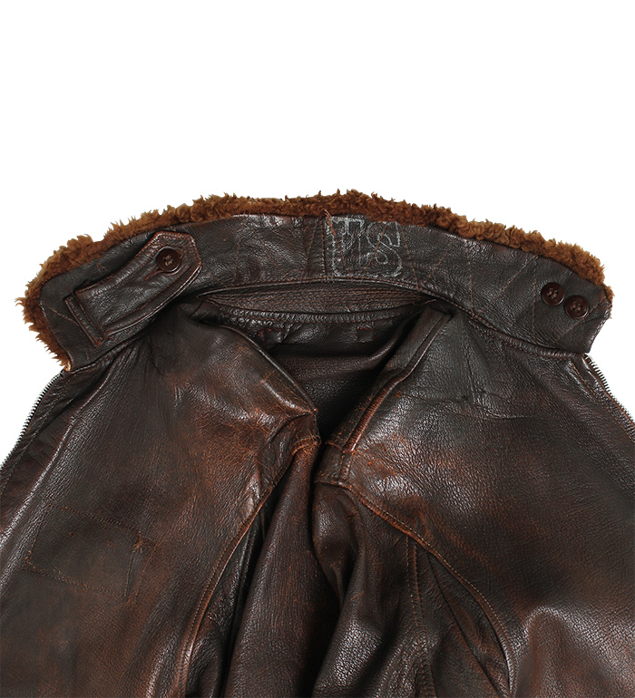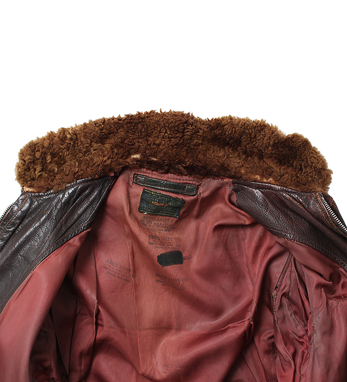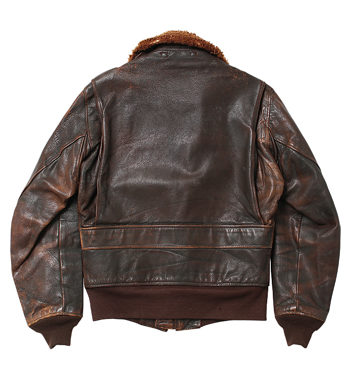 大戦時、米陸軍/海軍において決定されたフライトジャケット共通化のため開発され、1943年採用されたAN-J-3A。共通化目的での開発であったが実際の使用は海軍に限定された。ごく僅かな期間のみの生産モデル。襟裏部の『U.S.』マーキング、クリムソン(赤系)カラーのサテン地ライニングが特徴。コレクター放出品、実物・極上!!