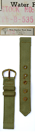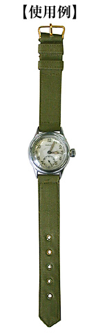 大戦時、米陸軍における最も典型的なタイプのコットン素材製の時計用ベルト。オリーブ(グリーン・カーキ)色タイプ。ベルト全長はレギュラー長。ベルト幅に3サイズあり。実物未使用品。