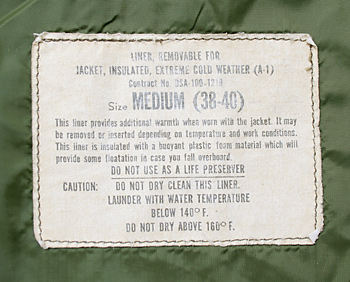 ■制式名称:LINER, REMOVABLE FOR JACKET, EXTREME COLD WEATHER (A-1)