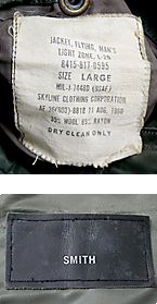 ・左胸:米空軍レザーネームプレート(上段にAF NAVIGATOR OR OBSERVER ウイング、下段に『SMITH』のネーム箔押しあり)/左上画像、下段参照