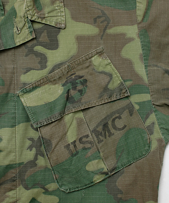 NAM戦時に採用、支給されていたERDLカモ(通称リーフカモ)野戦ジャケット。グリーンリーフ/初期リーフと呼ばれるグリーンの色調が強いタイプ。R/S生地製。海兵隊仕様。実物USED放出品。