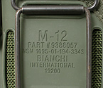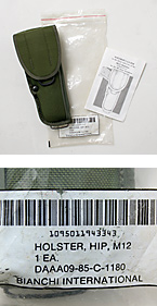 米軍における現用ピストル、M-9ベレッタ用 M-12ホルスター。本ホルスターの開発メーカー、ビアンキ社製で1985年コントラクト品。オリジナルパッケージ、説明書付。実物未使用放出品。