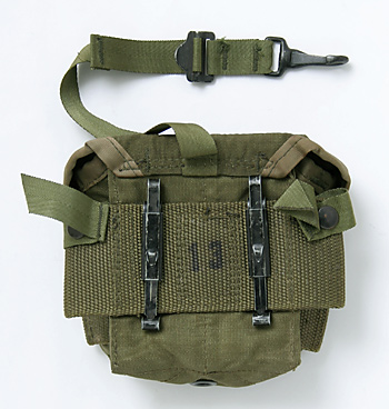 NAM戦時米軍においてコットンキャンバス製装備(M-1956/M-1961等)に替わり採用、製造されたナイロン製装備M-1967のM16ライフル用マガジンパウチ。20連4本用。実物極上放出品。