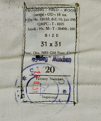 米陸軍において1952年に採用されたOD色のサージ織りウール・トラウザーズ。本品、ドイツ(ミュンヘン)での製造品。実物USED品。
