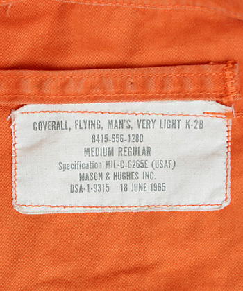 1960年代を代表するUSAFのフライング・スーツ K-2Bの中後期型(MIL-C-6265E)。本品、NAM戦時(65年)のオレンジ色仕様。実物極上品。