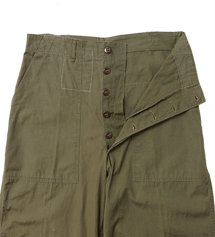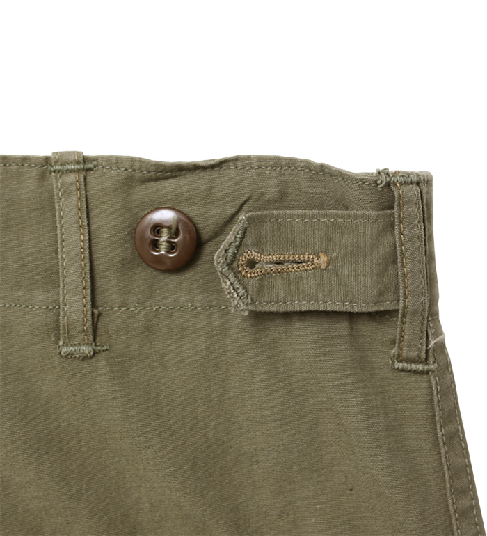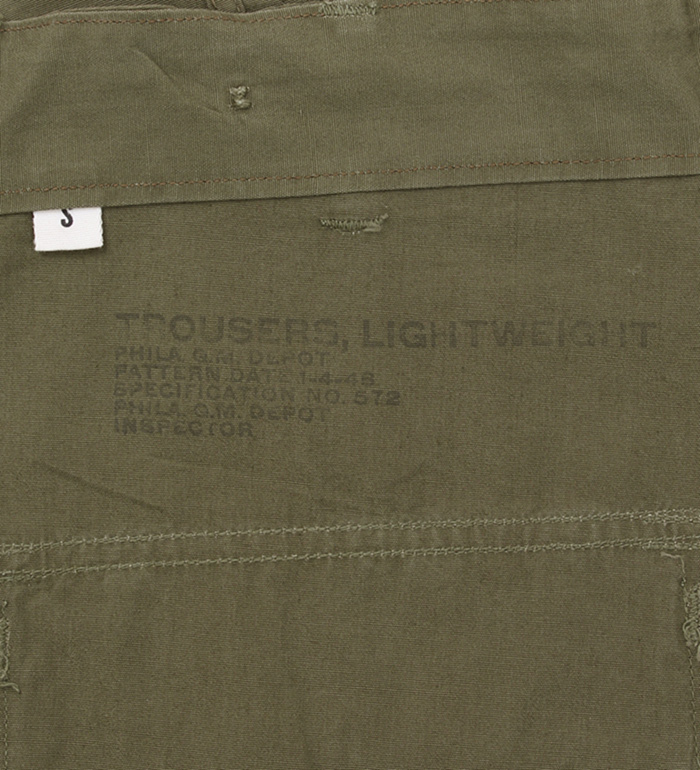 大戦直後(1946年1月4日)試験的に採用されたと考えられる『TROUSERS, LIGHTWEIGHT』。腰部両サイドに設けられたアジャスタータブ、ポケットの取り付け型式. . . .ほとんどの仕様が『OG107 Sateen Trousers, 1st Mode(1960-61年採用)l』へ継承された。マーキング、ラベルも残存し、極めてコンディションの良い実物・美品、米軍放出品! !