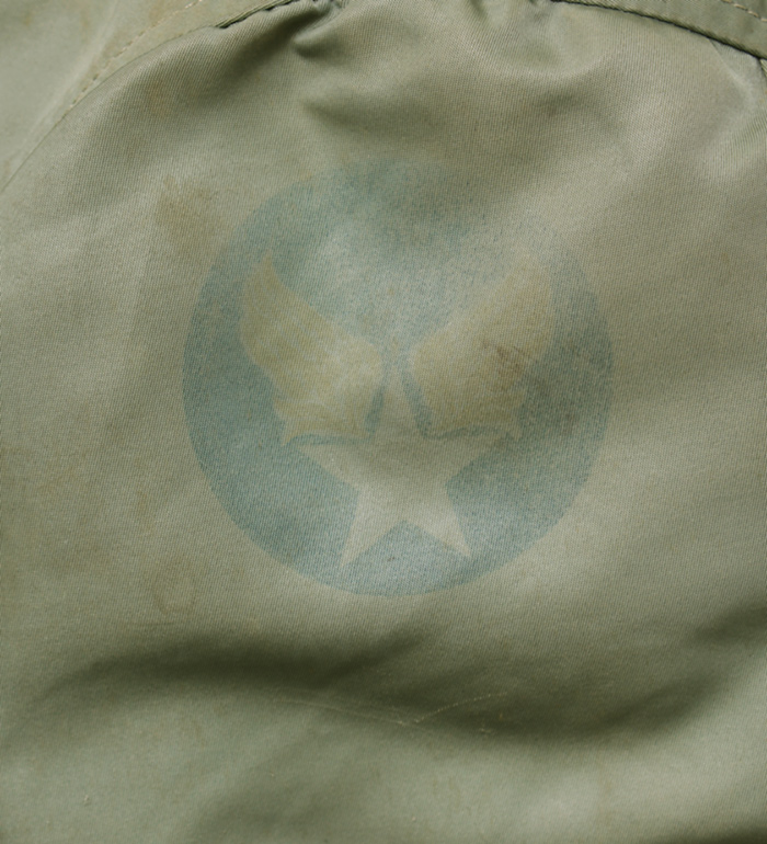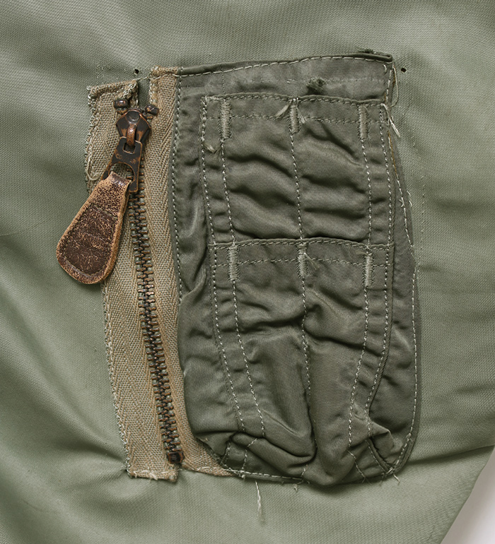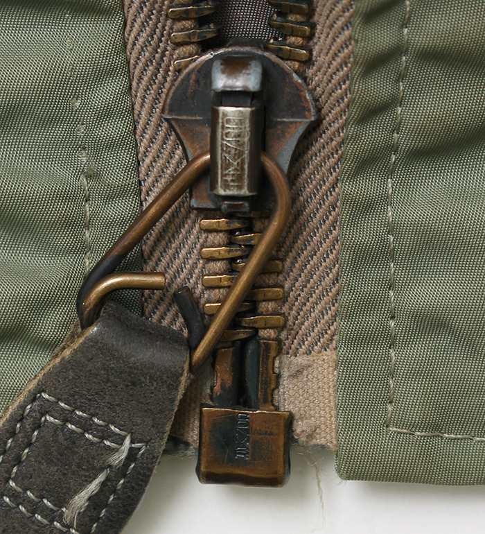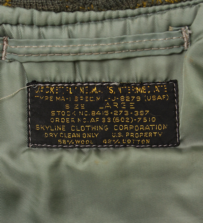 米空軍インターミディエート・ゾーン用 MA-1 フライト・ジャケット、1stモデル。左前身センターに付けられた酸素マスクホース固定用BOXタブ、両脇に設けられたICSコード固定用ストラップ(ドッドボタン開閉式)、角ばったウィンド・フラップ上端角、等はB-15Dの特徴が継承されている、MA-1の原型ともいえる1stモデル。1956年コントラクト、SKYLINE CLOTHING CO. 社製。実物、放出品! !