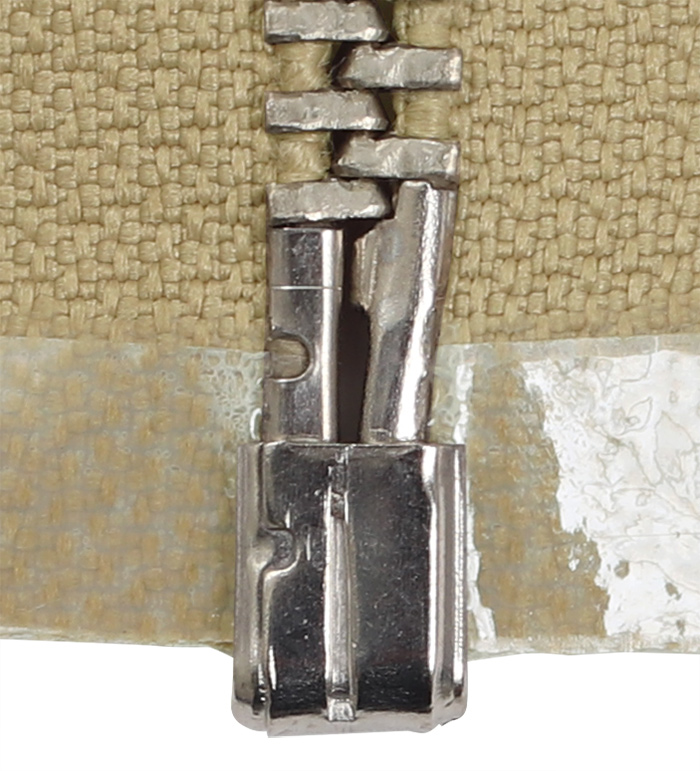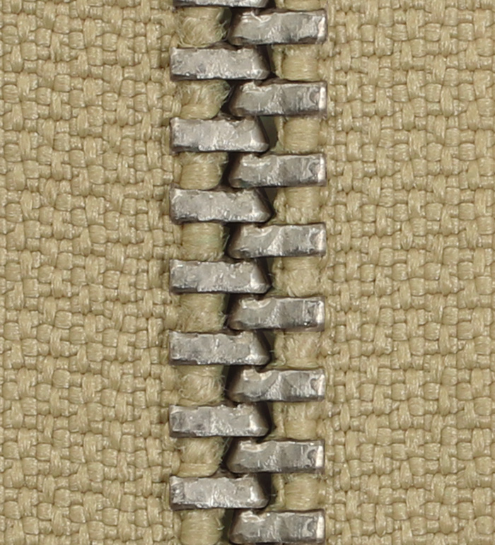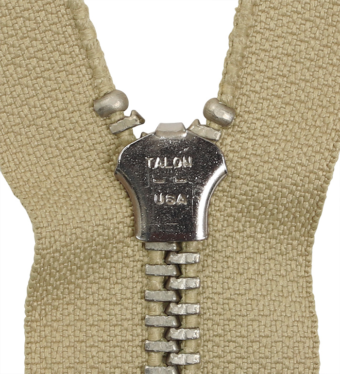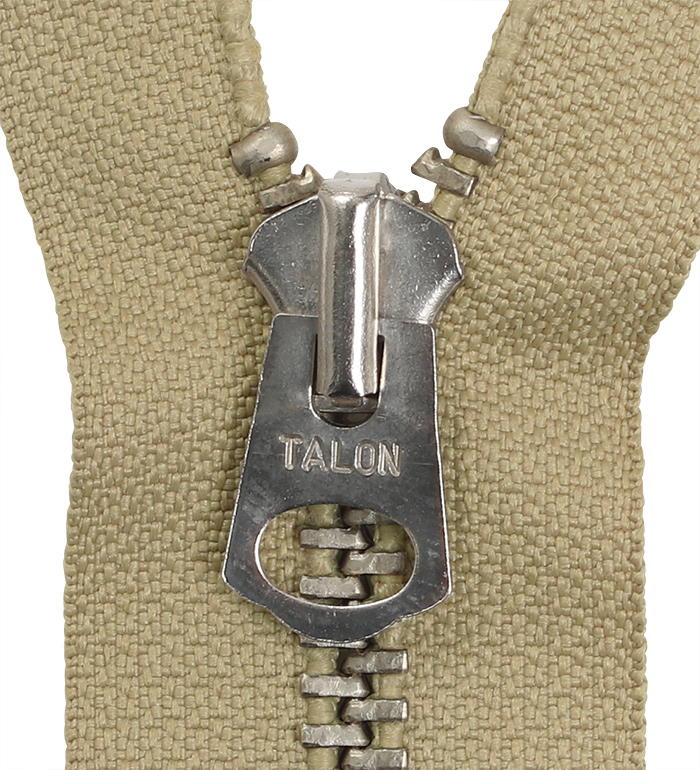Zipper創成メーカー、TALON社の主工場(ペンシルベニア州、ミッドビル)での最後の製造ロットと考えられる『1985年製、#5, ニッケルシルバー、タン(Tan)、オープンジッパー(Zipper)』。構成された各部パーツの仕上がりにTALON社ジッパー職人の意地と誇りが感じ取れる。実物未使用、米軍放出品 ! !