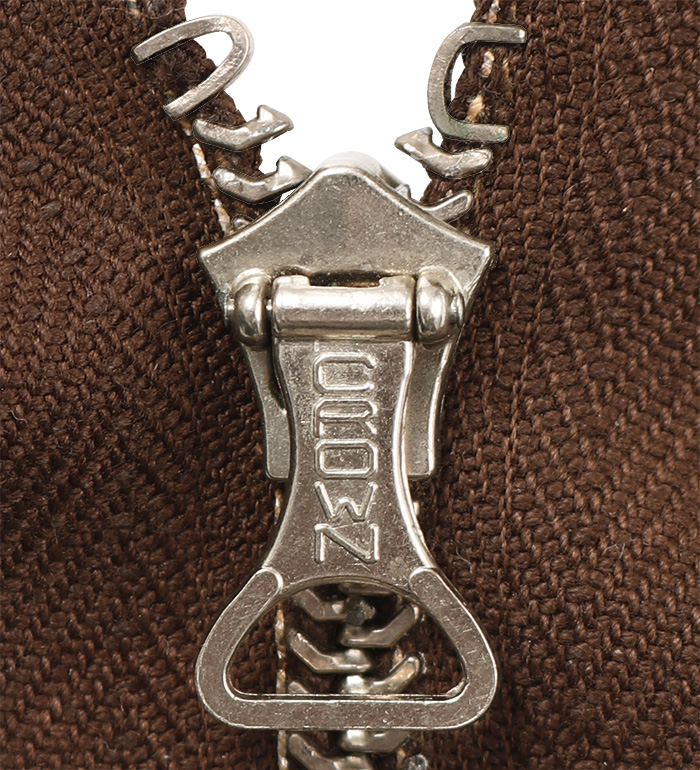 今や伝説ともいえる、大戦初期シェブロン型 CROWNジッパー(実物・未使用)は、TALON等、他のメーカーに比較し強度的には若干劣るとされていますが、その欠点を補って余りある独特の設計とデザインは多くのジッパーフアンを魅了して止みません。取り扱いには細心の注意をはらって頂けるようお願いいたします。
