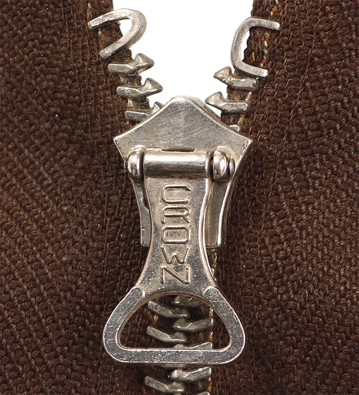 今や伝説ともいえる、大戦初期シェブロン型 CROWNジッパー(実物・未使用)は、TALON等、他のメーカーに比較し強度的には若干劣るとされていますが、その欠点を補って余りある独特の設計とデザインは多くのジッパーフアンを魅了して止みません。取り扱いには細心の注意をはらって頂けるようお願いいたします。