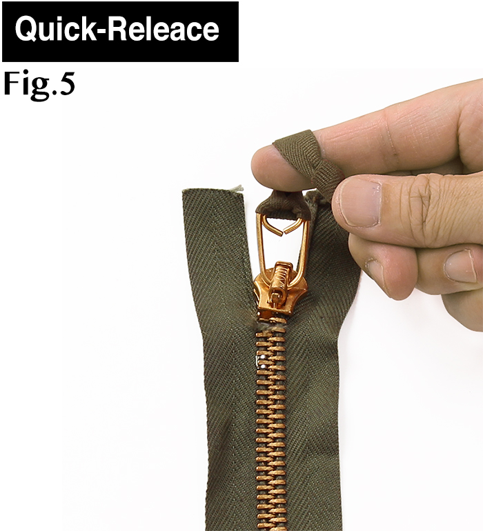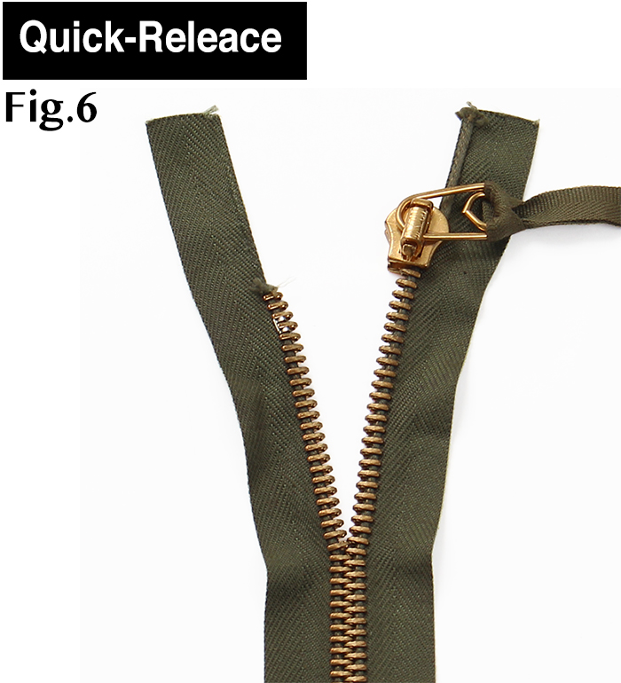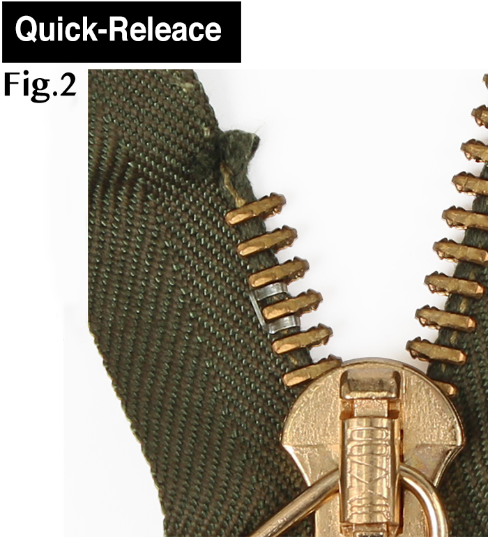 フライトトラウザーズに多く見られる上留め型式で、スライダーを下まで引き下げることが困難な緊急時、スライダー少し下げトップまで勢いよく引き上げることで、閉じたジッパーを上から簡単に開くことが出来る仕組み。