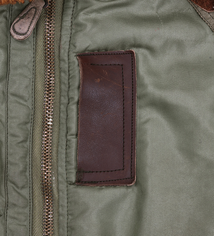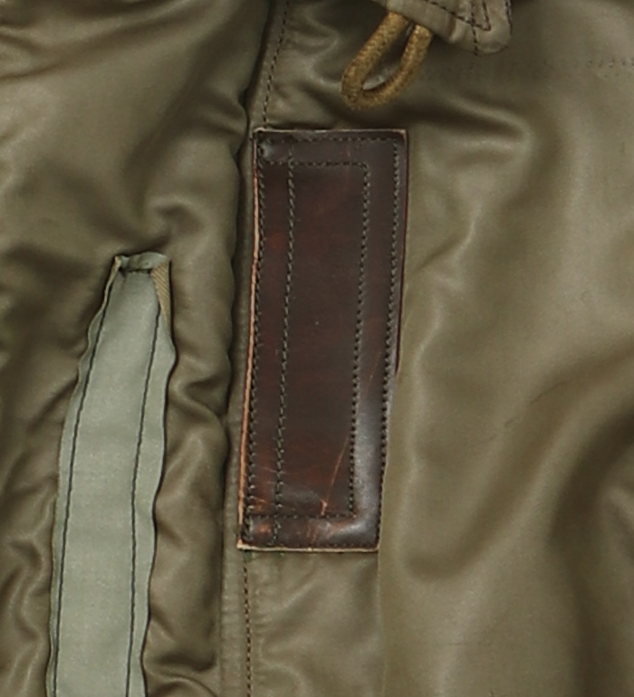 初期のナイロン・フライトジャケットの左胸に縫い付けられた“酸素マスクホース固定用革タブ”、馬革、Seal Brown(焦茶)、基本的な取り付け(縫いつけ)マニュアル同封! !