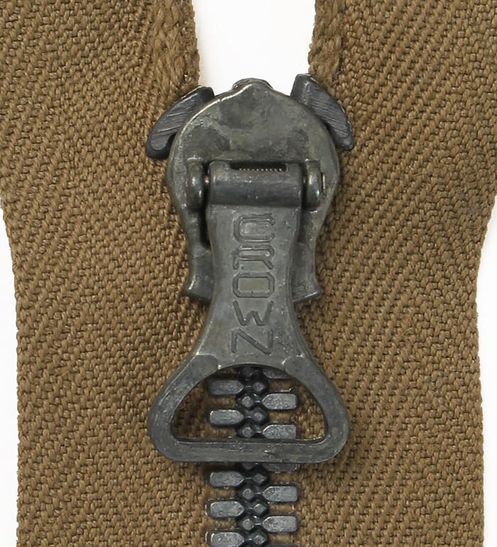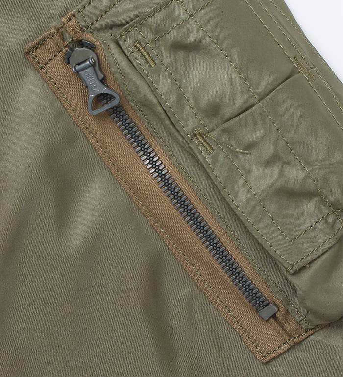 注)1949-50年にかけ採用、支給されたB-15B, L-2, N-2, N-3の袖ポケに使用された『CROWN Zipper』のテープ色は元来『オリーブ色』であったものが、残存する殆どが『タン色』に経年変色しているため、同時期(1947-50年頃)に製造された『オリーブ色』の実物クラウンジッパーを『タン色』に後染めしたものです。