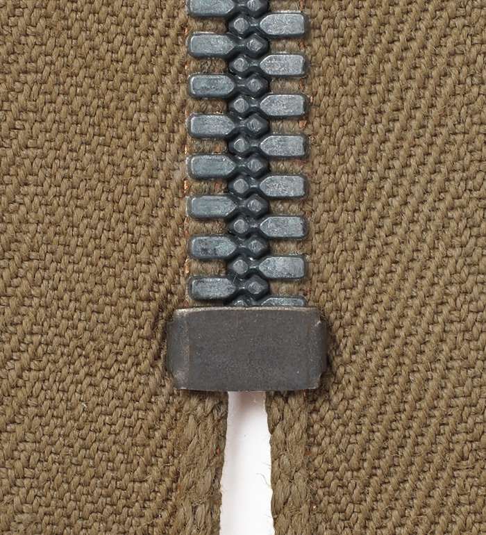 注)1949-50年にかけ採用、支給されたB-15B, L-2, N-2, N-3の袖ポケに使用された『CROWN Zipper』のテープ色は元来『オリーブ色』であったものが、残存する殆どが『タン色』に経年変色しているため、同時期(1947-50年頃)に製造された『オリーブ色』の実物クラウンジッパーを『タン色』に後染めしたものです。