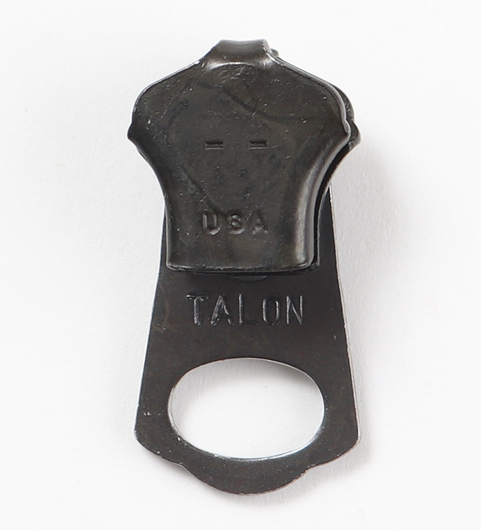 M45の後継として1950年頃より製造が開始されたM50型、M45との違いはスライダー上部左右にカーブを付けられ、スライダーの上げ下げをよりスムースに出来るよう改良された点にある。引き手の形状はM45に同じベル型(楕円穴)。1985年頃、ペンシルベニア州ミッドヴィルに在したTalon社主工場での操業を終えるまで製造を続けられたTalon社5番スライダー、ベーシックモデルの最終型だと考えられる。Brass(黒仕上)、実物・未使用 ! !