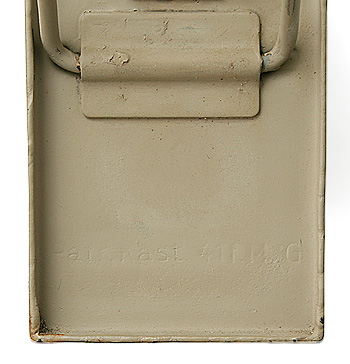 大戦ドイツ軍において1941年より採用、支給された蓋横サイドがフラットで、従来のM34型より大きく開く事の可能となったMG34/42機関銃用弾薬箱(AMMO BOX)。天頂部に補強用リブライン、両サイドに開閉用ノブ付きの後期仕様タイプ、M-41型AMMO BOX 、実物・極上! !