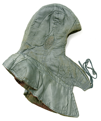 WWII、ドイツ陸軍において冬期戦闘用として開発支給された、ウォーターパターン迷彩フード、『コープシュッツァー』と呼ばれる筒状のニット製頭巾(トーク)をかぶり、その上に着用した。裾部が長いのは防風、防寒の為。実物・極上。