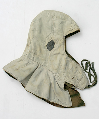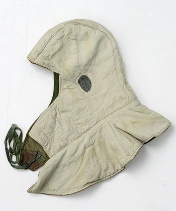 WWII、ドイツ国防軍において冬期戦闘用として開発支給された、ウォーターパターン迷彩フード、『コープシュッツァー』と呼ばれる筒状のニット製頭巾(トーク)をかぶり、その上に着用した。実物・極上。