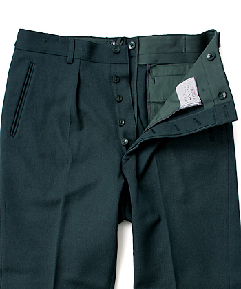 WWII終了後、再編されたBW(ドイツ連邦軍)の衣料、装備から大旨、大戦色が一掃されたのに比較し、編成時のBGS(ドイツ連邦国境警備隊)の衣料、装備においては、ここまでと思われる程、大戦時への類似性が色濃く残された。紹介する『BGS 初期型 制服用ウール・トラウザーズ』もその1つである。実物・未使用、1点物、コレクターズ・アイテム!!