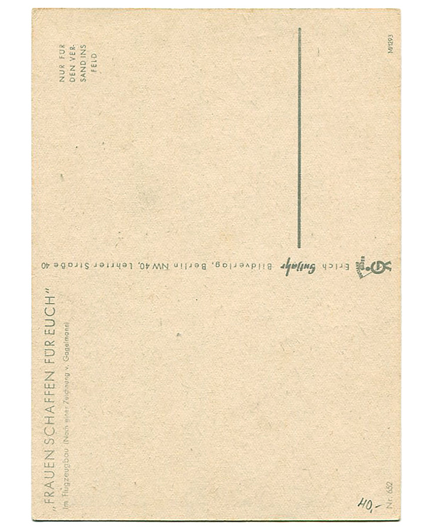 大戦時、プロパガンダ巧者であったドイツ軍は様々な『ポストカード』を発行した。紹介は当時のドイツ有名イラストレーター(Gagelmann)のイラストによるポストカード。裏面左上には『あなたのために働く女性達』とプリントされている。全て1点もの、お見逃しのないように! !