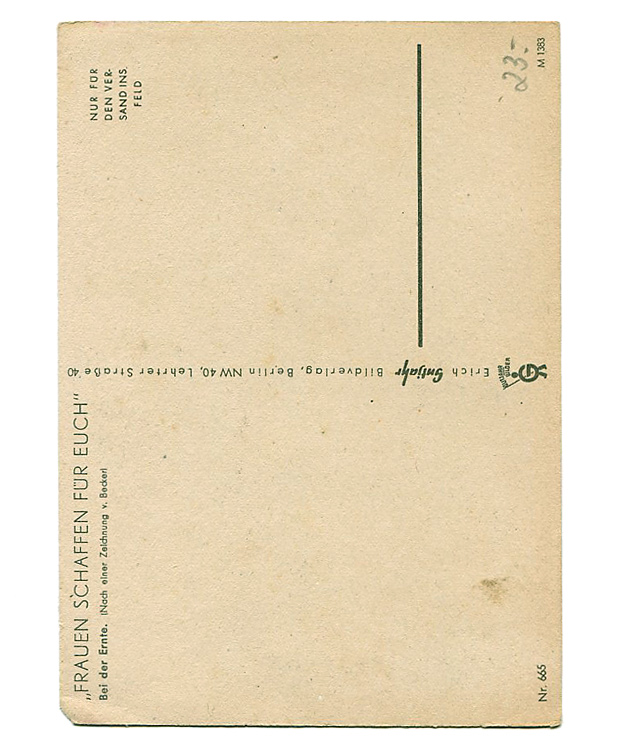 大戦時、プロパガンダ巧者であったドイツ軍は様々な『ポストカード』を発行した。紹介は当時のドイツ有名イラストレーター(Becker)のイラストによるポストカード。裏面左上には『あなたのために働く女性達』とプリントされている。全て1点もの、お見逃しのないように! !
