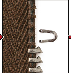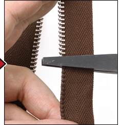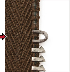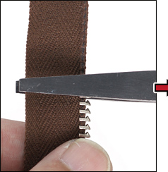 | 左側(ピン側)に使用する上止め(B)は『務歯』に接し固定して下さい。『務歯』に接し固定するには若干こつを要します。いきなり『務歯』に接し足を差し込もうとせず、ジッパートップから2番目の『務歯外し跡』に画像のように片足を差し込み固定した状態で『務歯』に接した足をテープに押し込みます。押し込む際、最初に差し込み固定した方の足を、しっかり固定しないと『務歯』と上止めの間に隙間が出来ます。可能な限り隙間が出来ないように押し込んで下さい。位置が決まり、曲がりを調整した後は、右側同様、先幅が5-10mmのペンチでテープを痛めない程度に前後からプレスし固定して下さい。トップの『務歯』と共にプレスするのは右側と同じです。 |