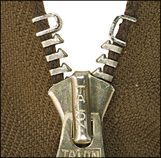 | TALON, CONMAR 等、CROWN 以外の当時の大多数のジッパー・メーカーは、TEETH 製造方式においてプレス方式をとり、この方式で製造されたジッパーの長さ調節は、少しこつさえ掴めばさほど難しくはなく、工具も特殊な物は必要なくニッパー、ラジオペンチ程度で充分です。ジッパーを購入されてから下記を参照いただき、使用するジャケット等に合わせ調節される事をおすすめ致します。只、ご自身での長さ調節がご面倒な方は、私共で調節済みの物を送付させていただきます。下記の“ご注文に際し”を参照ください。 |