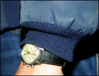 腕時計は袖ニットの大敵(リューズ等がニットに引っかかりほつれの原因になるケースが多い)、袖口にニットが用いられたフライトジャケット等を着用する時は腕時計を使用しない心配りがニットの寿命を倍加します。 |