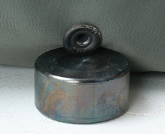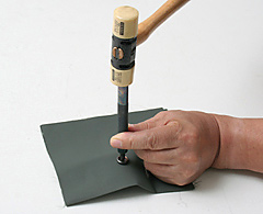 | “Cap”の足に“Socket”の穴を通し、“Cap”の足の頂点に打ち棒の先を正しく置き、垂直に保った打ち棒の頭をハンマーで何度かに分け叩き、“Cap”の足をプレスし曲げる。“Cap”の足が丸く曲がり、取り付けたボタンを手で軽く回し回らなければOK。 注-1)1度でプレスしようとせず、4〜5回程度に分け叩き曲げるのがこつです。丸く曲がらず一部が裂けても2個のパーツがしっかり止まっていればOKです。 注-2)使用するハンマーはプラスチック製の物か木製のハンマーが力が緩和され適していますが、無ければ、鉄製の物でもOKです。 |